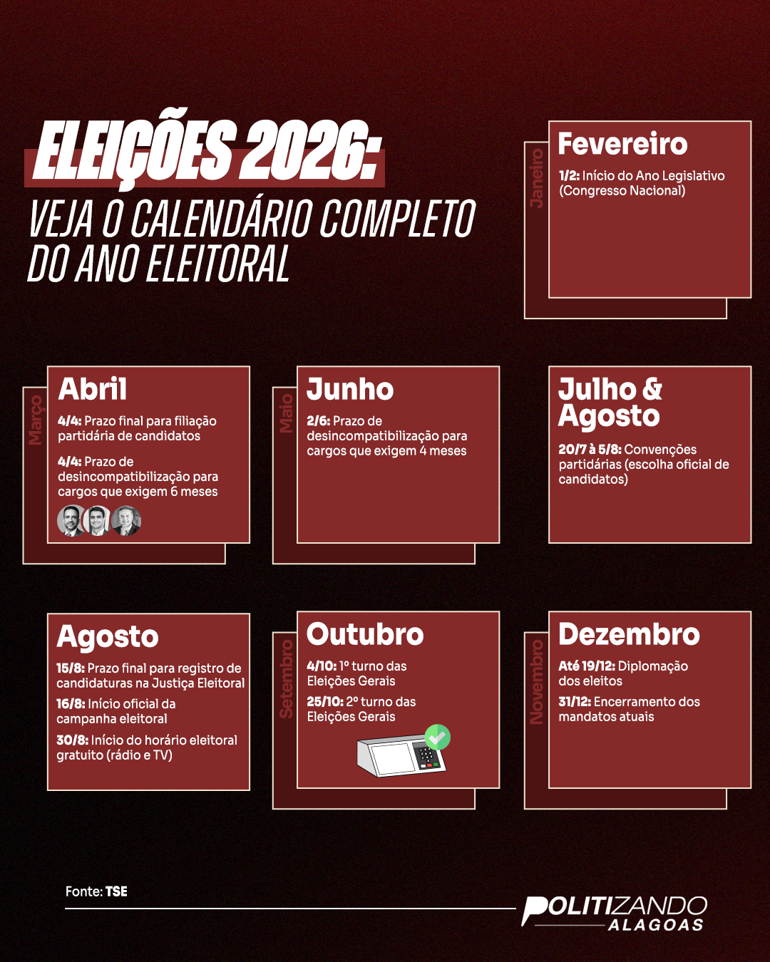 O calendário oficial das Eleições de 2026, divulgado pelo Tribunal Superior Eleitoral (TSE), estabelece uma sequência de prazos que passa a orientar, desde já, a movimentação dos partidos e dos pré-candidatos em todo o país.